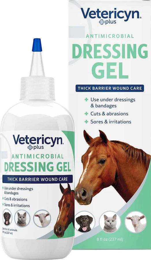This wound dressing clings to the application site to create a protective barrier around cuts, scraps, abrasions, and other minor wounds. When used under a bandage, the gel keeps the wound moist to maximize the healing process. Protects as it heals by keeping dirt and debris out of the wound. Safe for sensitive areas as it will not cause dermal irritation. For best results, thoroughly clean the wound with Vetericyn All Animal Wound and Skin Care.Â