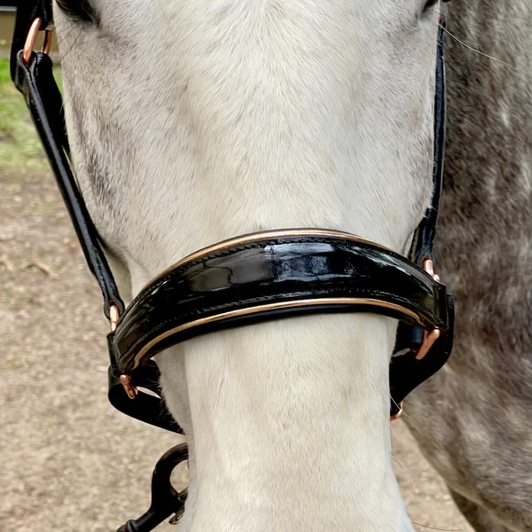 This beautiful halter is made with black patent leather, ultra-soft, Nappa leather padding, rose gold buckles and fittings, and luxurious metallic rose gold piping.