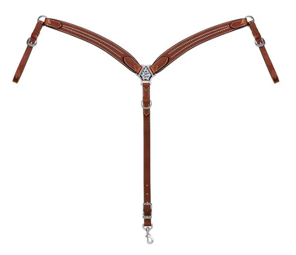 Offering a high end, showy look without a high price, this rich brown premium English bridle leather tack has a soft, smooth and refined feel. The beautiful variation of brown tones in this leather coordinates with medium oiled saddles for a put-together look. Horse Shoe Brand floral stainless steel hardware with black accents designed by custom saddlemaker Jeremiah Watt and etched nickel brass spots give this piece show ring-worthy appeal. Black chrome tanned laces at bit ends. Horse size. Handcrafted in the USA by Weaver Leather.