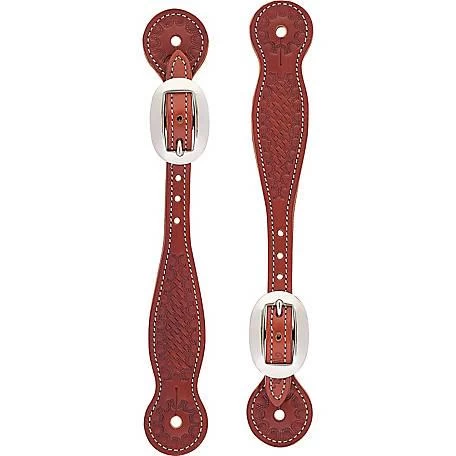 Skirting leather spur straps with a stamped basketweave pattern and non-rust stainless steel hardware. Made in the USA
