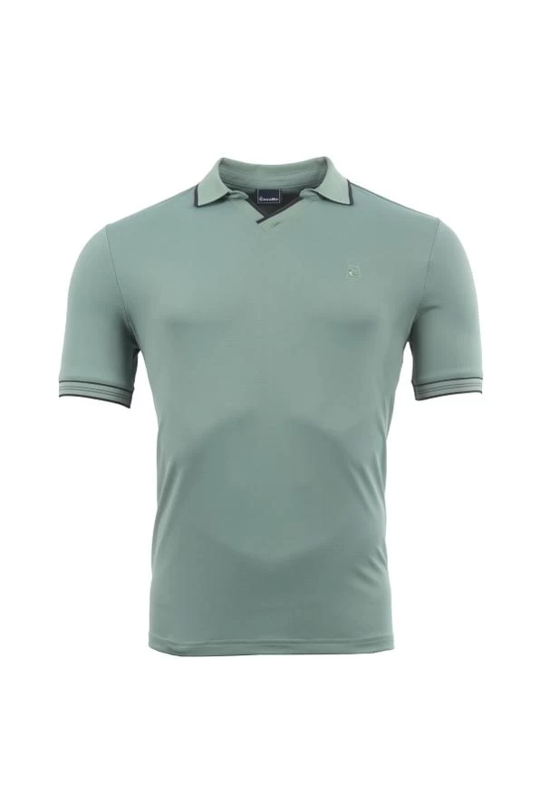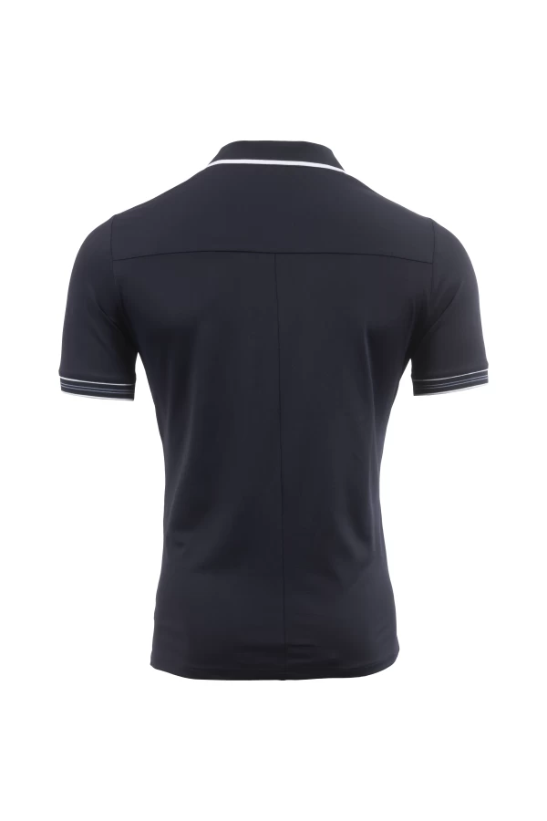 - Contrasting stripes along the ribbed inset at the neckline and collar edge