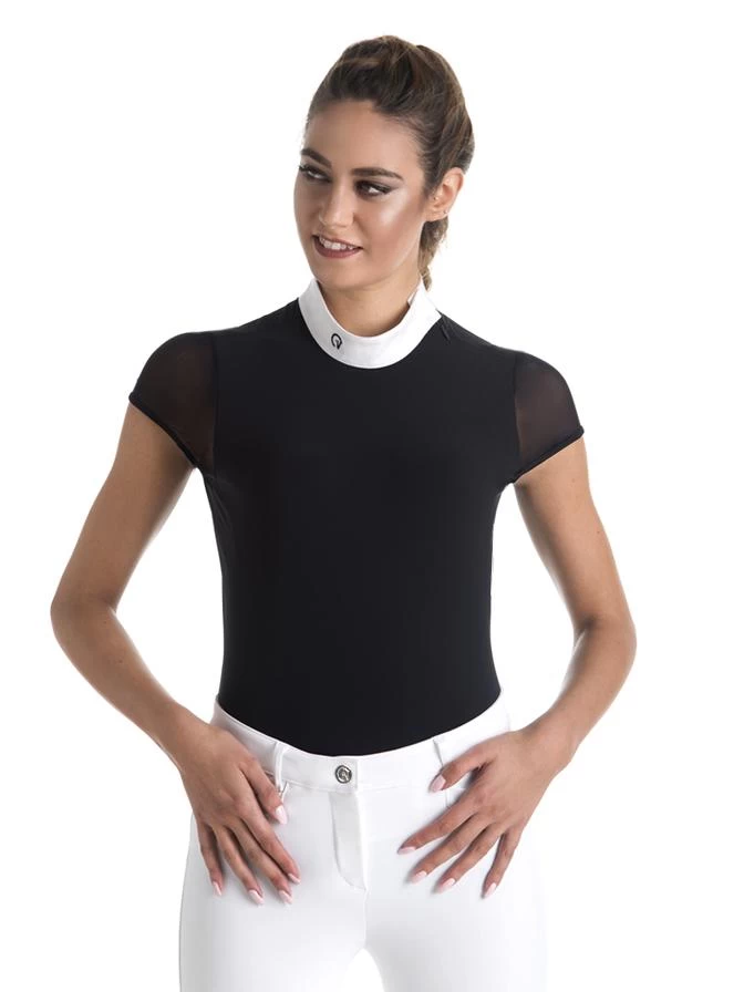 Rita, technical women’s riding shirt, stretch, breathable and comfortable. Mandarin collar with invisible button and transparent fabric on sleeves and back detail