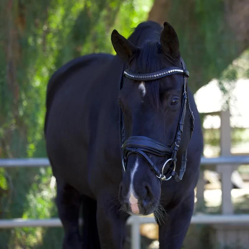 Sophisticated black snaffle bridle made with elegant black croc print on the anatomical noseband and browband, black patent piping, and a scintillating ombre crystal design browband. The anatomical crownpiece, and buttery soft padding on the noseband provide ultimate comfort for your horse. Matches perfectly with the Doc Marten Spur Straps.Â