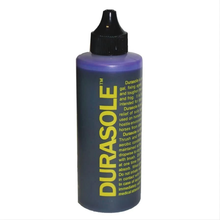 Durasole creates a tough, living pad between your horse’s sensitive sole and the world’s hostile environment. Durasole is an antibacterial, antifungal fixing agent formulated to thicken and toughen the exfoliating sole and frog. Durasole is effective in the control of thrush and white line disease when aerobic conditions are established and maintained at the infection site. Can be used for extended periods of time on chronically thin-soled horses without fear of drying out the foot.
