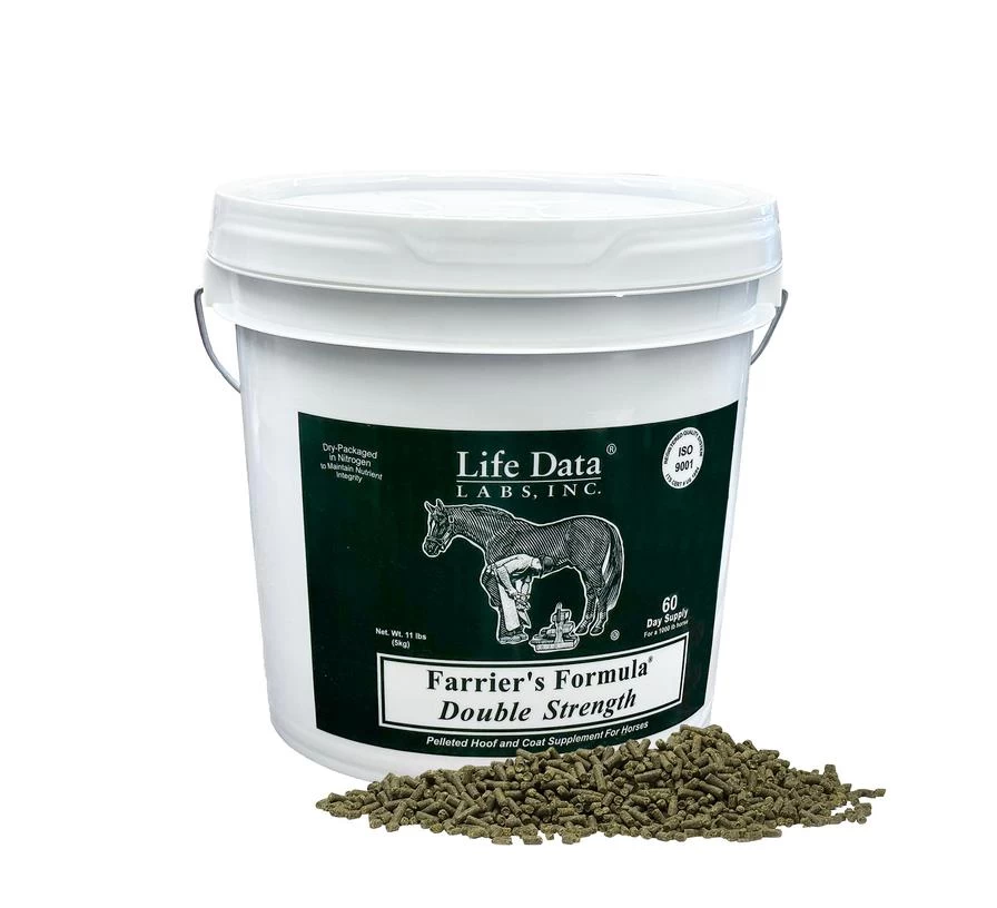 Farrier’s Formula®Double Strength is a pelleted hoof supplement that can be added as a top dressing on the regular feed or given separately. It provides nutrients such as phospholipids, omega fatty acids, vitamins, minerals, and important amino acid “protein building blocks” for a healthy hoof and hair coat. These nutrients are provided at twice the concentration compared to the original Farrier’s Formula®.
