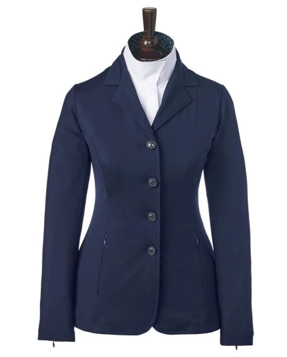 The Grand Prix® EQJ Quinn Show Coat provides a polished, modern slim fit and supports your comfort in competition. Made from EQJ fabric, this easy-care ladies’ show jacket is extremely stretchy and lightweight—ideal even in hot conditions. A hidden front zipper under a four-button placket offers a smooth, gap-free look. Zippered sleeve openings allow easy on and off. Constructed to flatter with princess seams on the front and back.