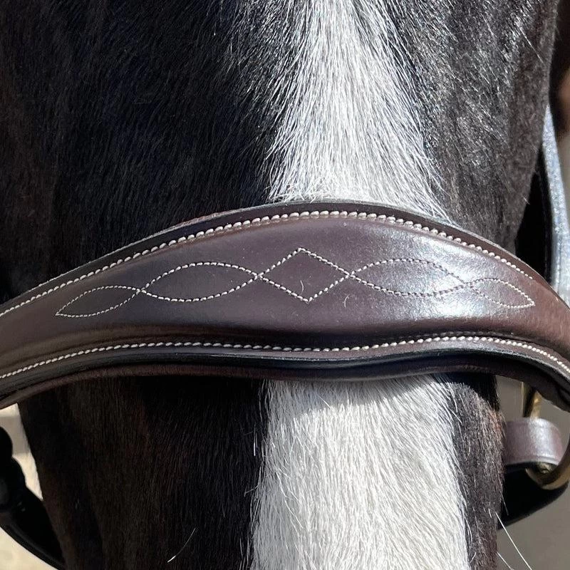 This classic brown leather halter features a conical tapered noseband, padded anatomical crownpiece, stylish fancy stitching, and brass hardware for a sophisticated and timeless design.Â