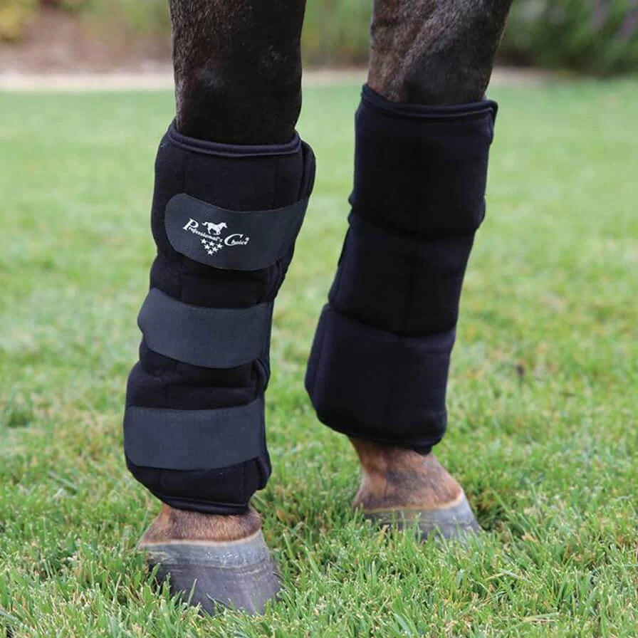 Neoprene exterior insulates the frozen gel pockets keeping the boots colder longer, thus increasing the therapy time. Smooth nylon lining eliminates the potential for damaging the tissue from exposing the skin directly to ice; while also preventing dirt, shavings and debris from sticking to the boots. Extended hook and loop straps allow easy application for all horses. Packaged in a convenient set of two these boots also come with a mesh carrying bag. To activate, place in freezer until frozen, can be then transferred to ice chest or cooler for use away from the barn or a freezer. 30-Day Money-Back Guarantee/Six-Month warranty or as required by law. Sold in pairs.