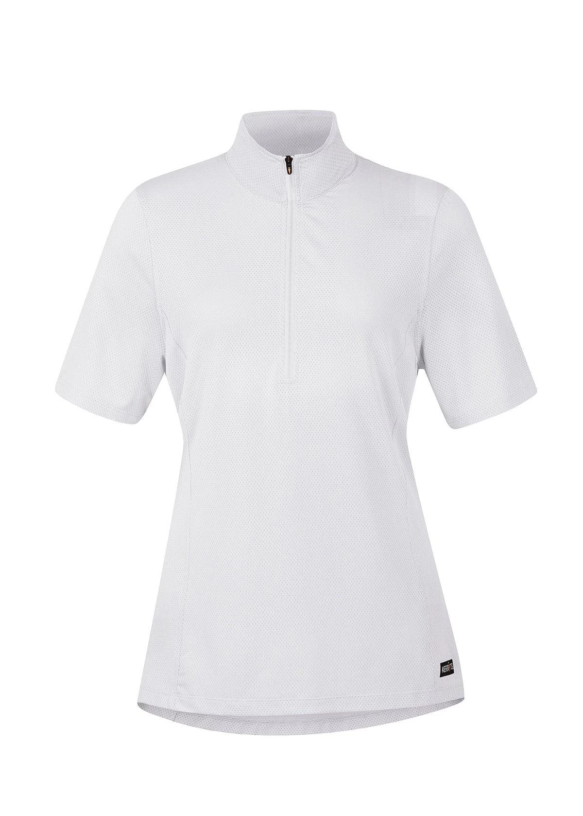 Featherweight Ice Fil® helps lower skin’s surface temp by up to five degrees while providing UPF+30 protection. Ten-inch zip allows further ventilation. The sporty, feminine fit, and equestrian hem flatter for everyday wear, while the stock tie loop and stand-up collar add sophistication for the showring. Shaped: Follows the contours of the body without being fitted.
