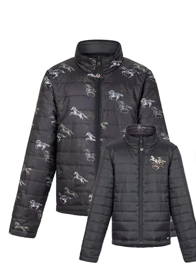 Kids can have twice the cozy fun with this completely reversible, hip length jacket! Showing the whole herd or just a few horses, 100-gram of quilted insulation with an equestrian hem keeps kids warm in the saddle and beyond. Tall collar keeps kids warm; variety keeps them happy.