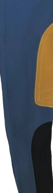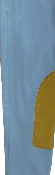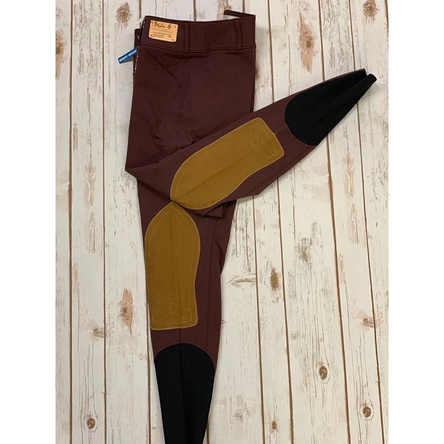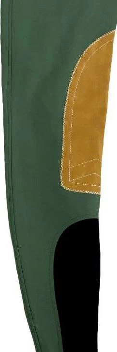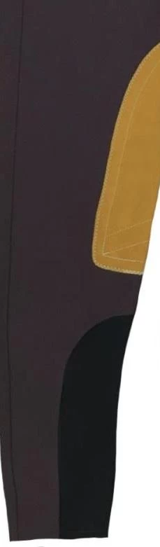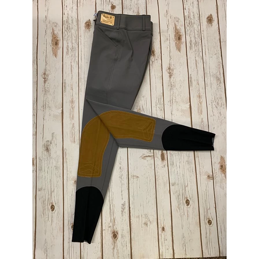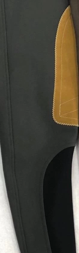 Low-rise, front zip, Euro seat breech in 73% cotton/20% microfiber/7% lycra 4-way stretch fabric with Clarino knee patches, wide waistband, Velcro ankle closures. Machine washable and made in the USA
