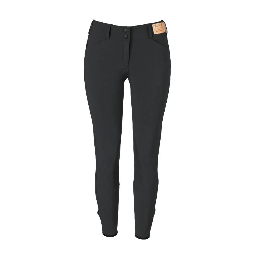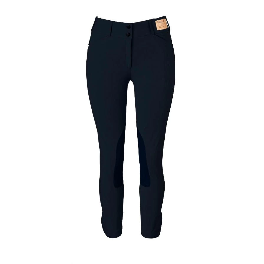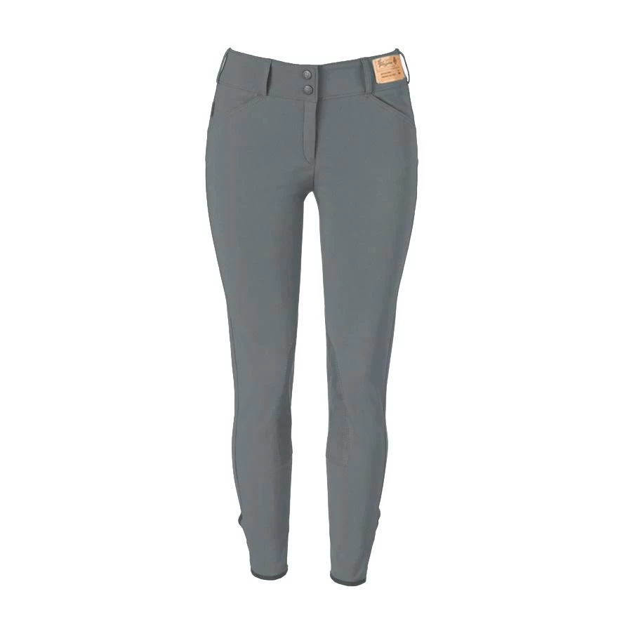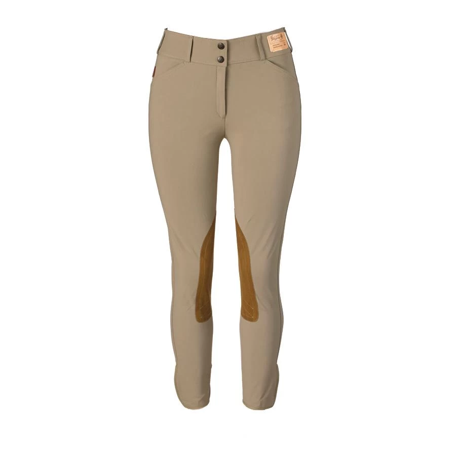 Low-rise, front zip, Euro seat breech in 73% cotton/20% microfiber/7% lycra 4-way stretch fabric with Clarino knee patches, wide waistband, Velcro ankle closures. Machine washable and made in the USA.