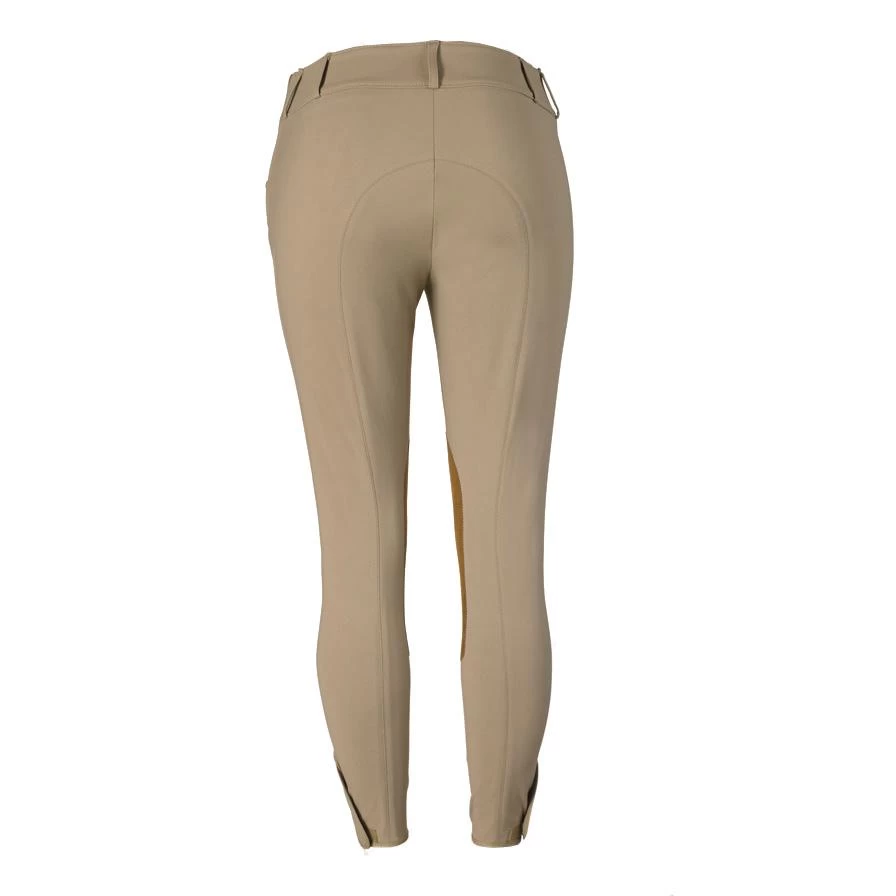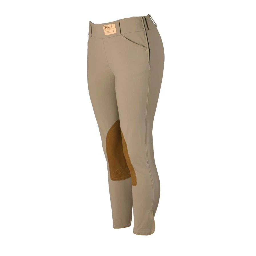 Mid-rise, side zip, Euro seat breech in 73% cotton/20% microfiber/7% lycra 4-way stretch fabric with Clarino knee patches, wide waistband, Velcro ankle closures. Machine washable and made in the USA.