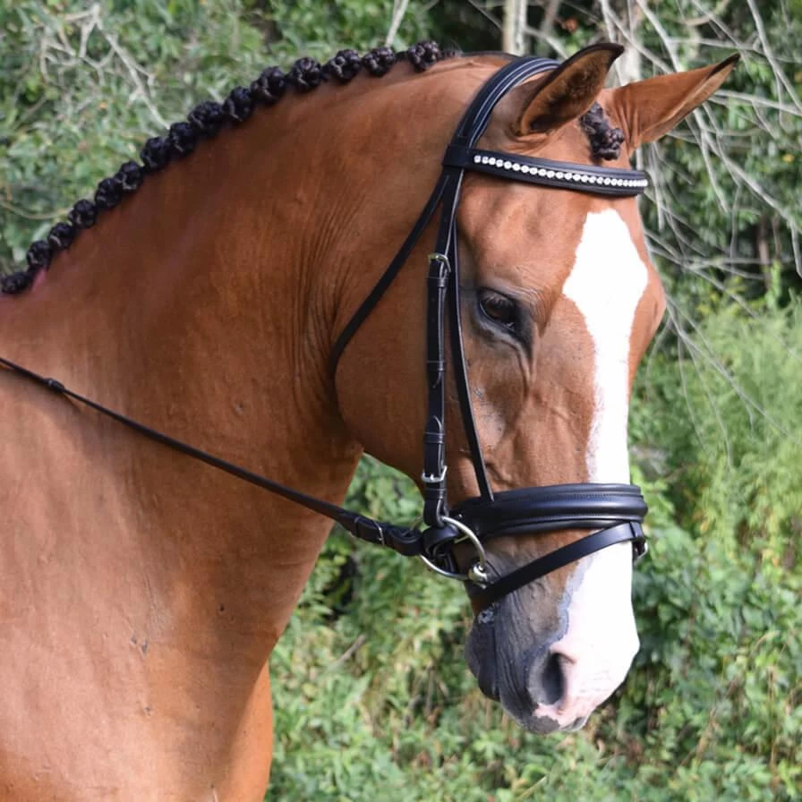 The Black Oak economy Larkspur Dressage bridle combines exceptional value, with the quality craftsmanship & details KL Select products are known for. The Larkspur features a clear crystal browband that adds sparkle and dresses up the extra wide flash crank noseband. The Larkspur has a 1 5/8” round raised noseband with extra padding for comfort of the horse, a padded 1” crystal browband, 5/8” cheek pieces and a soft padded threaded headstall. Comes complete with ¾” Dressage Reins. This bridle is made in a top quality drum-dyed Spanish leather. All hardware is stainless steel, with buckle ends, and a roller buckle on the noseband.