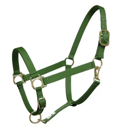 Nylon halter with snap and adjustable chin strap. Made in the USA.