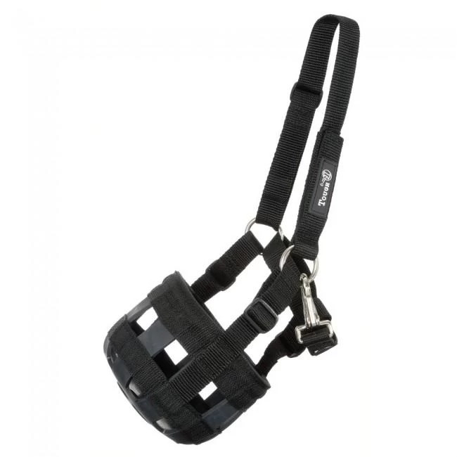 Control overeating with this quality nylon web halter/muzzle combination. Small rubber opening at bottom restricts consumption of grass while grazing. Features a 5-way adjustable fit system with ?quick grip? fastener and easy clip-on cheek. Complete with padded noseband for comfort and a dee ring for leading to and from turnout. Nose measures 25″ around and 7 1/2″ deep, Crown adjusts 16″ ? 25 1/2″, Throat adjusts 12″ ? 18″