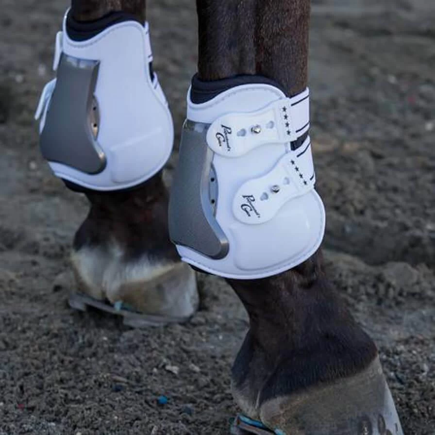 Pro Performance Show Jump Boots are designed with an innovative, shock-absorbing airbag cushion for maximum tendon impact protection. These anatomically shaped boots are lightweight, comfortable, and sit perfectly positioned on the horse’s leg. The boots do not absorb water, are durable, easy to clean, and quick to dry. These boots feature a ventilated dual hardness outer shell which is designed to dissipate energy when the strike area is hit. The shock-absorbing air cushion fits in an anatomically shaped strike area, reducing the force of impact and then returning to its original shape. Features adjustable and durable TPU fasteners. Perfect for both schooling and the show ring. CLICK HERE for the matching front boots.