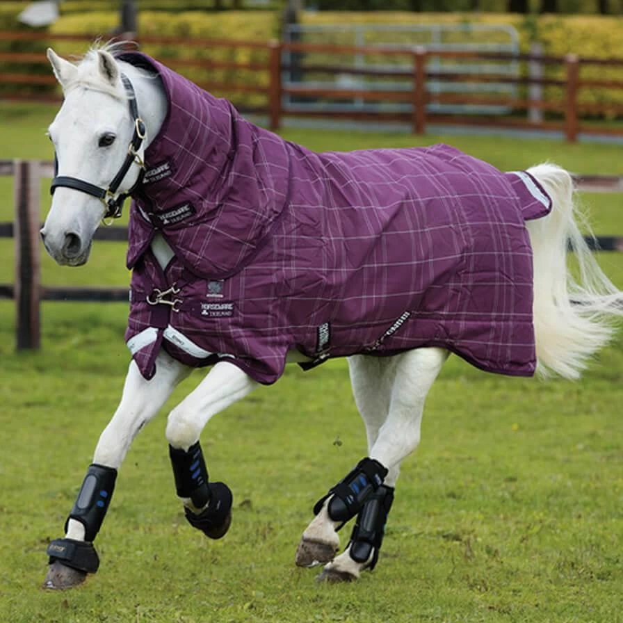 Sure-fit neck design and V-front closure for freedom of movement while grazing, leg arches, detachable hood included, liner loops, shine enhancing polyester lining and cross surcingles. 1000D polypropylene outer, waterproof and breathable barrier layer underneath. Comes with anti-static, anti-bacterial polyester lining and 200g thermobonded fibre filling.