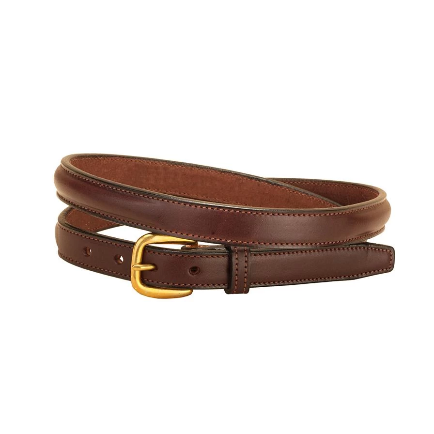 3/4” BRIDLE LEATHER BELT WITH A ROUND RAISED CENTER, STITCHED EDGES, FLAT SPACE FOR A NAME PLATE AND A SEWN BRASS BUCKLE