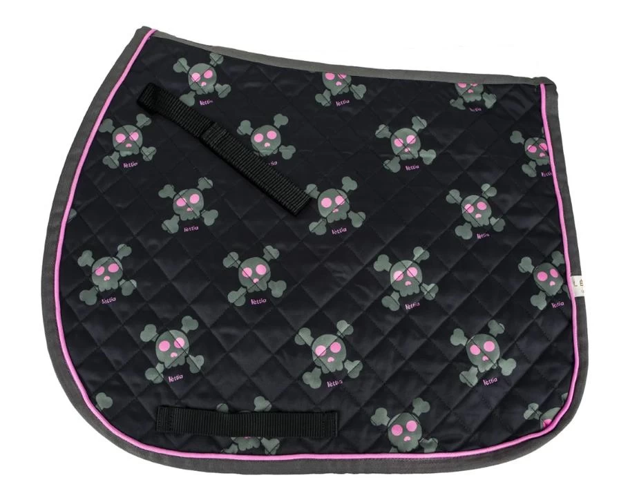 This baby pad is fun and function all in one! Thanks to the additional girth loops, you can use this saddle pad as a traditional baby pad or by itself to show off the fun designs. Dimensions: 22″ X19″. Pair it with the Lettia Padded Skull And Crossbones Boot Sock or the Lettia Skull And Crossbones All Purpose Pad to complete the look.Â