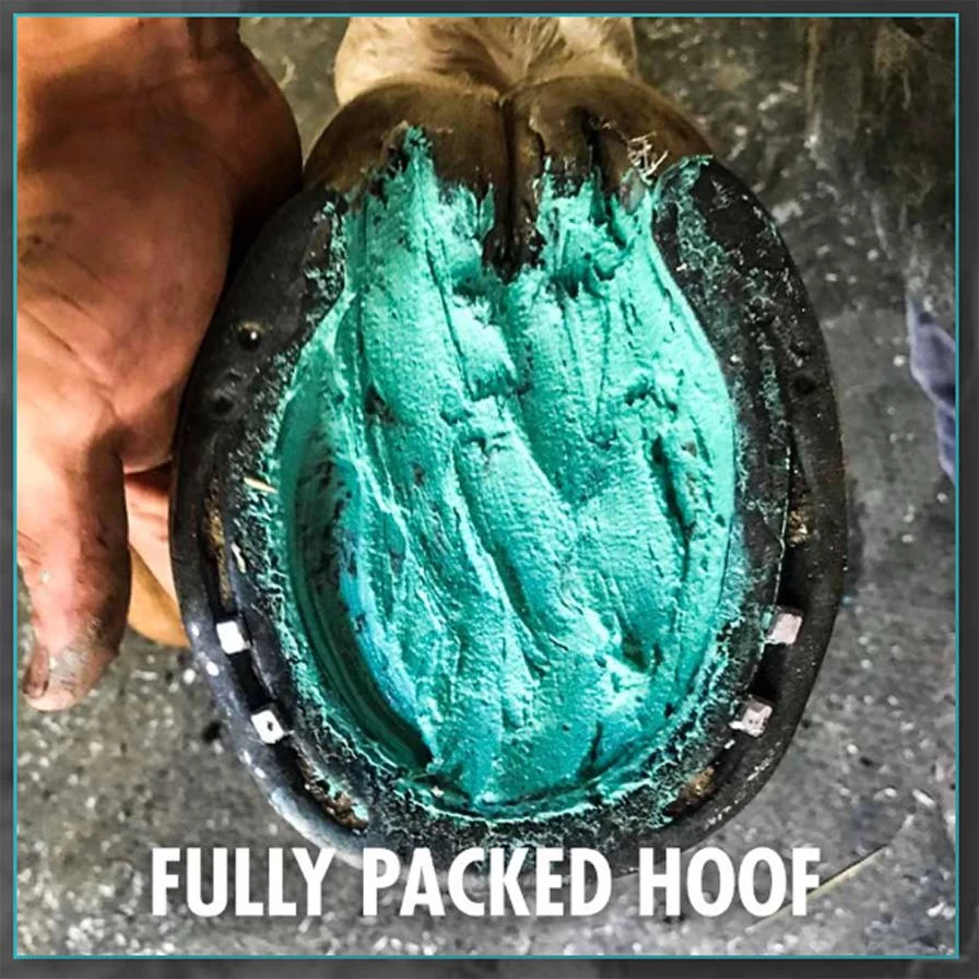 Thoroughly clean and dry hoof. If possible, remove necrotic material before generously applying onto all parts of the hoof affected by thrush.