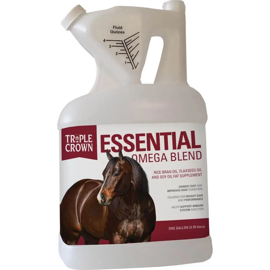 Triple Crown Essential Omega Blend is a unique combination of rice bran oil, flaxseed oil and soy oil. The Omega-3 fatty acids are required for optimal immune system function and improved hair and hoof condition, while Omega-6 fatty acids are effectively used for extra calories by hardworking horses or hard keepers.